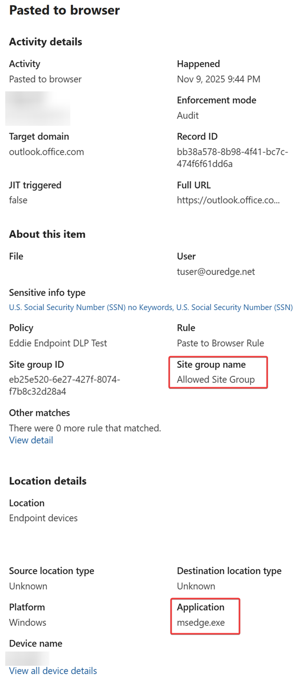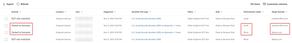 Paste to Browser activities show up as Activity = Pasted to browser. We should see a Block event for when we tried to paste sensitive data to dlptest.com. We should also see a separate event from our successful attempt at pasting the same data to outlook.office.com
