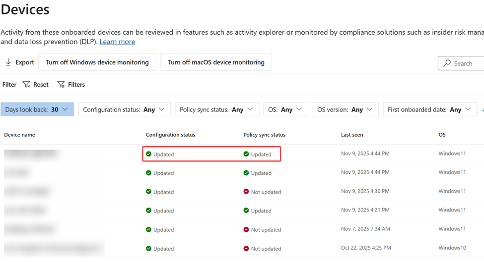 Navigate to Settings > Data Loss Prevention > Device Onboarding > Devices and make sure, for your device, both Configuration status and Policy sync status show Updated with green check marks.