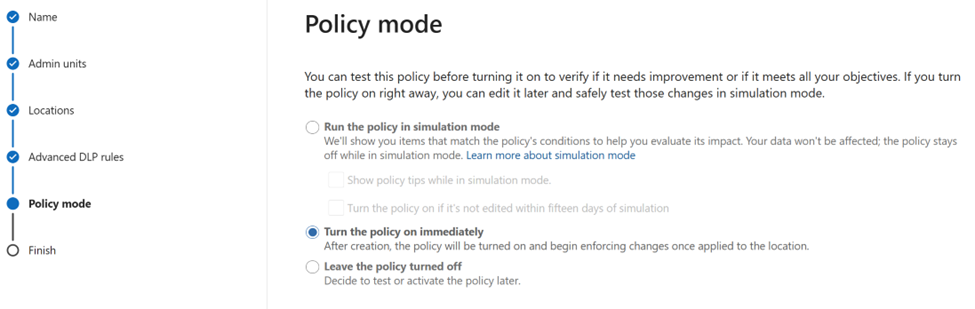 - I recommend running the policy in simulation mode first and reviewing the logs in the Activity Explorer to confirm it is working as expected before turning it on. In this example, I will be turning it on immediately since the policy is scoped to my test user and test device, so no big deal if things do not work as expected. Select Next and finish creating the policy.