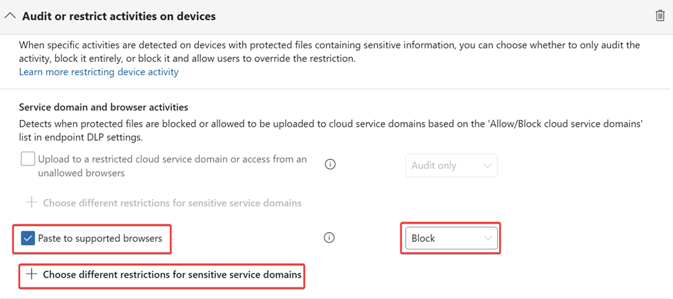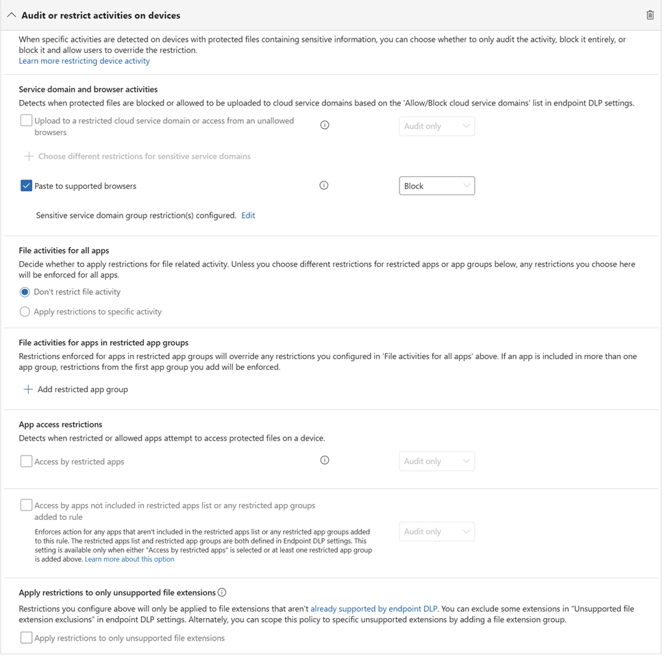 - Since our goal is to simply restrict Paste to Browser, we have purposely turned off all other settings within the Audit and restrict activities on devices
