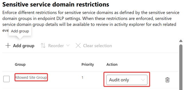 - Select Choose different restrictions for sensitive service domains > Add group > select the Domains group you made > Add > set the Action to Audit only > Save