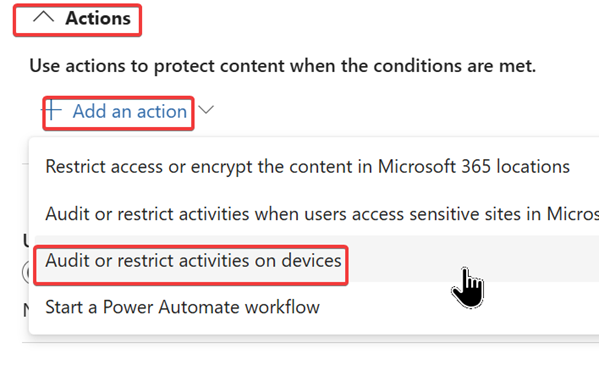 - Under Actions, select Add an action > Audit or restrict activities on devices