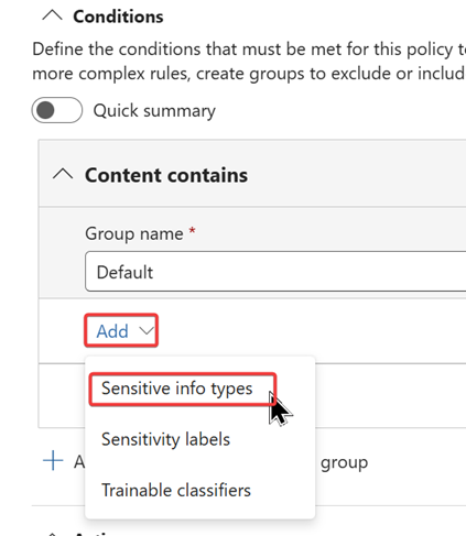 - This adds a Content contains section with a default group. In this section select Add > Sensitive info types