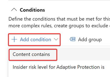 - In this example we want to detect Sensitive Infor Types, or SITs, so under the Conditions section we choose Add condition > Content Contains