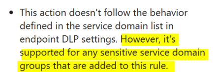 For the Paste to Browser DLP activity, we need to use the Sensitive Service domain groups area. As shown in the tooltip below, the list of websites in the Sensitive service domains area does NOT do anything for pasting to the browser. That list works for other activities such as Upload to cloud, which is also very useful but not the topic for today.